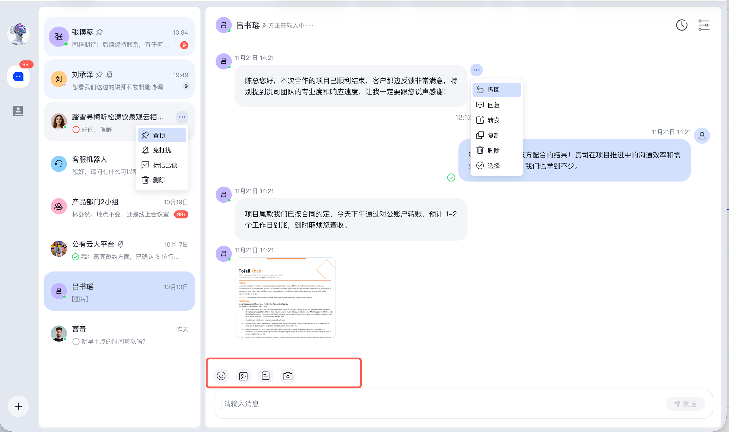Web IMKit 输入组件内置了基础输入菜单,除了发送文本消息外,还可以通过菜单触发表情、图片、文件、拍照等能力。